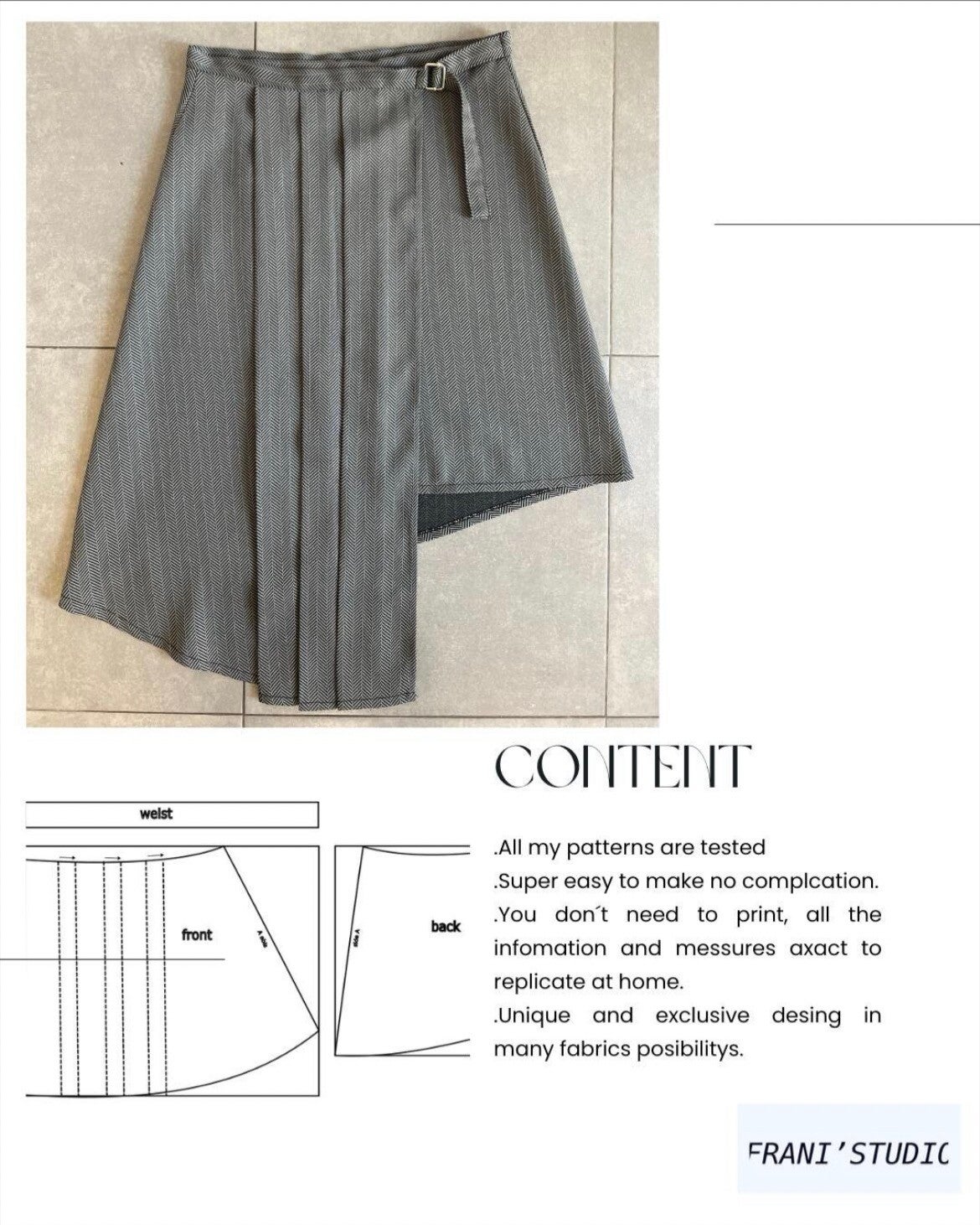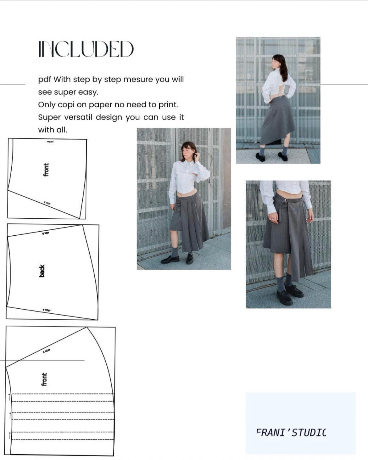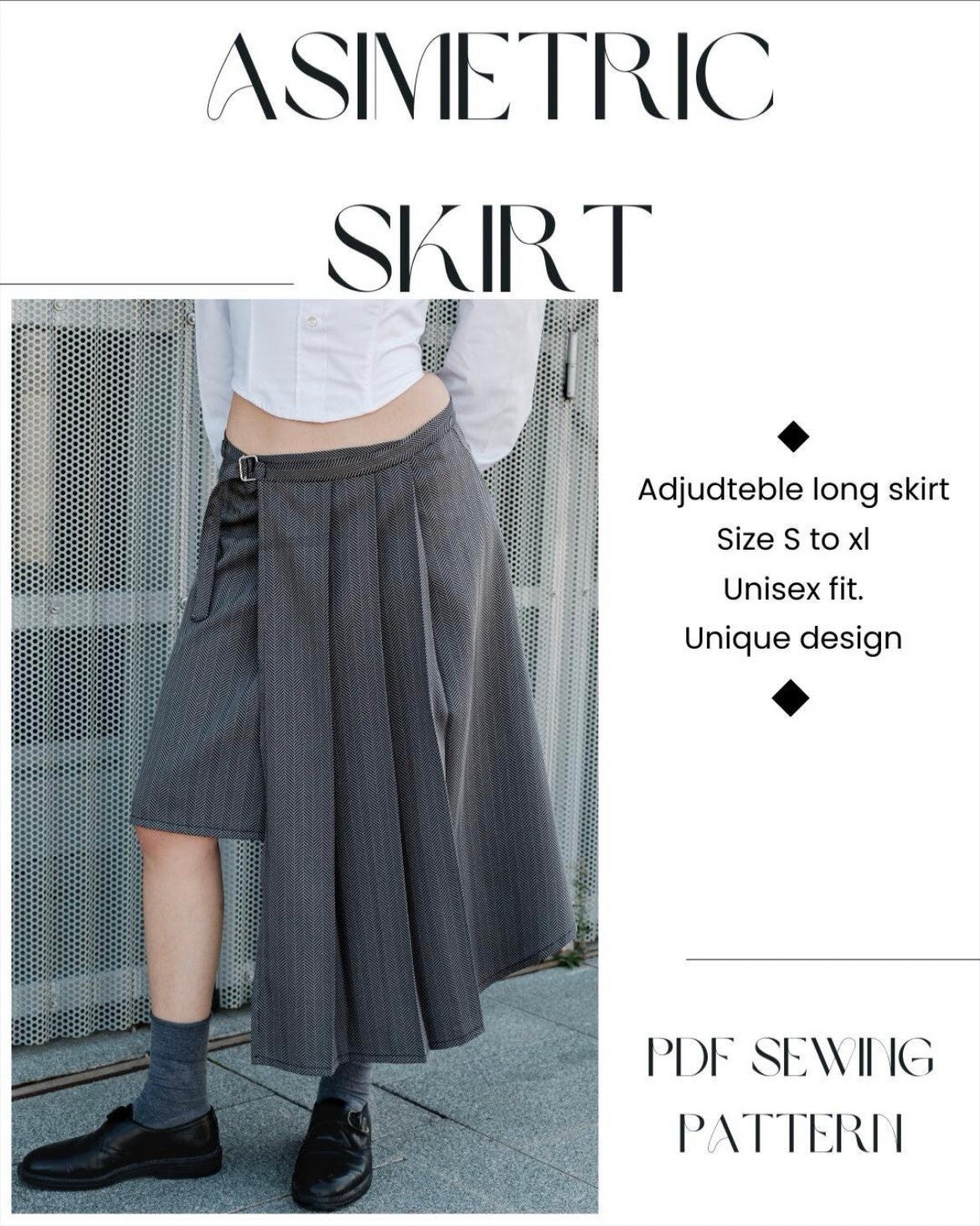 This is a digital sewing pattern (PDF) for creating a unique asymmetrical pleated skirt. One side is longer, flowing with elegant movement, while the other side is shorter, creating a bold and modern silhouette. The skirt features soft pleats and a comfortable waistband, making it both stylish and wearable.