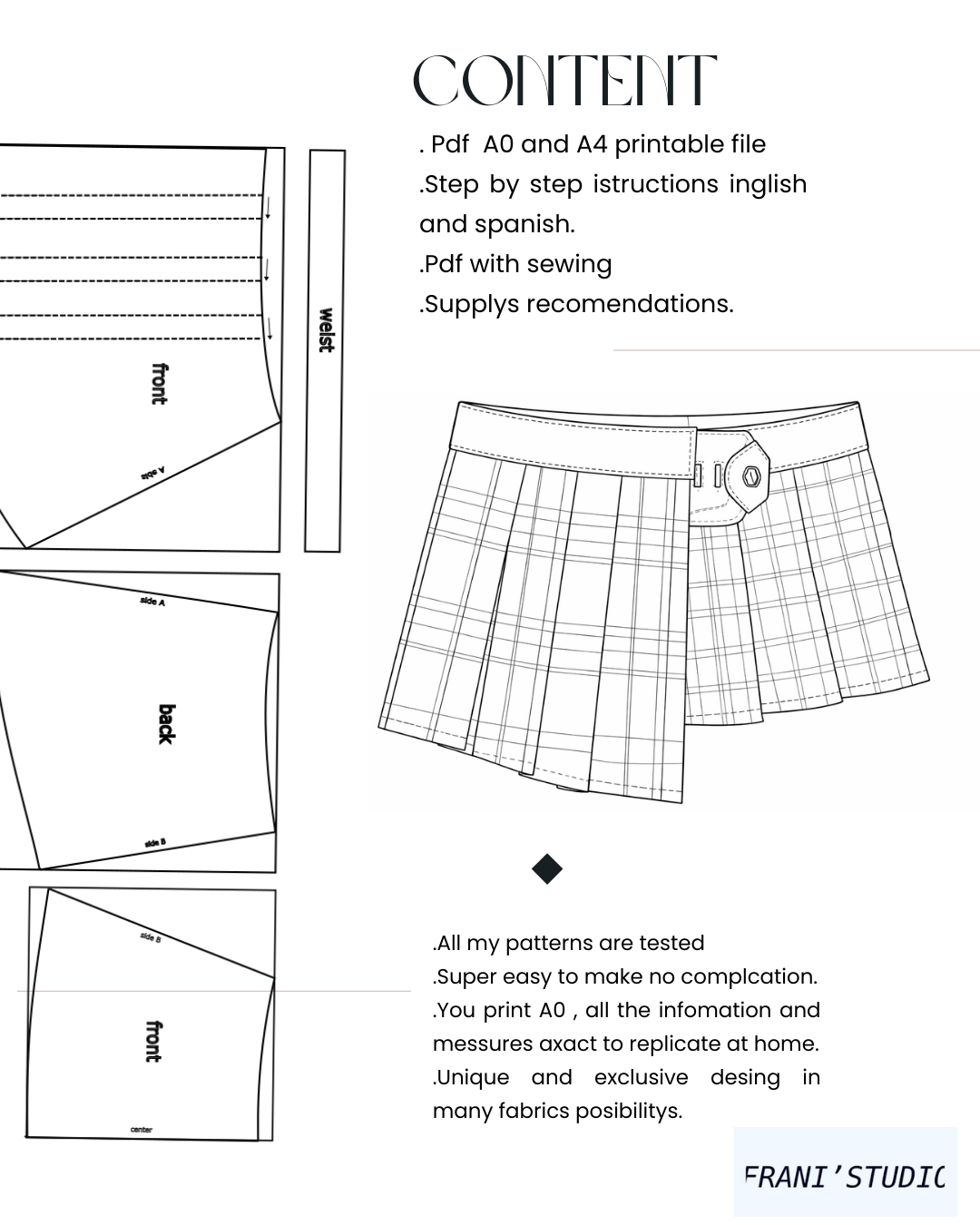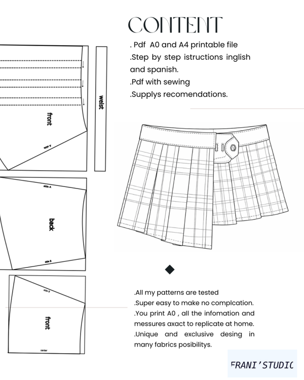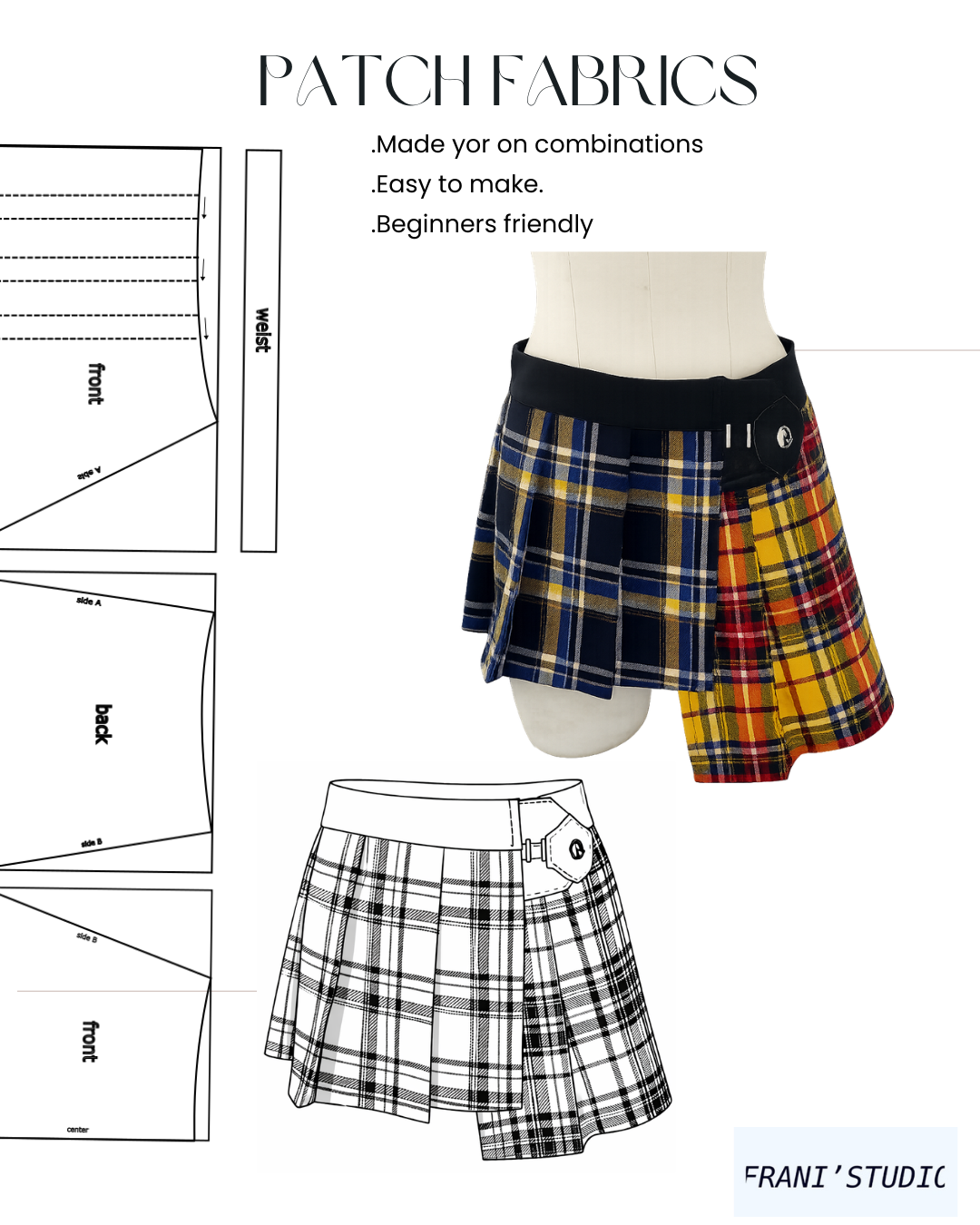 The pattern is designed for a sharp finish, with pressed pleats and a clean waist structure. Perfect if you like punk references, school silhouettes, and bold patchwork contrast.