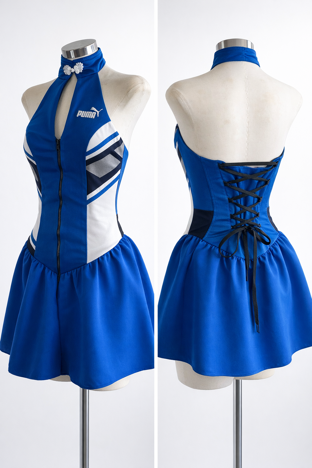 Mini corset dress made from a vintage Puma jacket, reconstructed into a fitted silhouette with a flared skirt.
